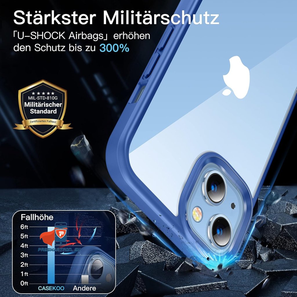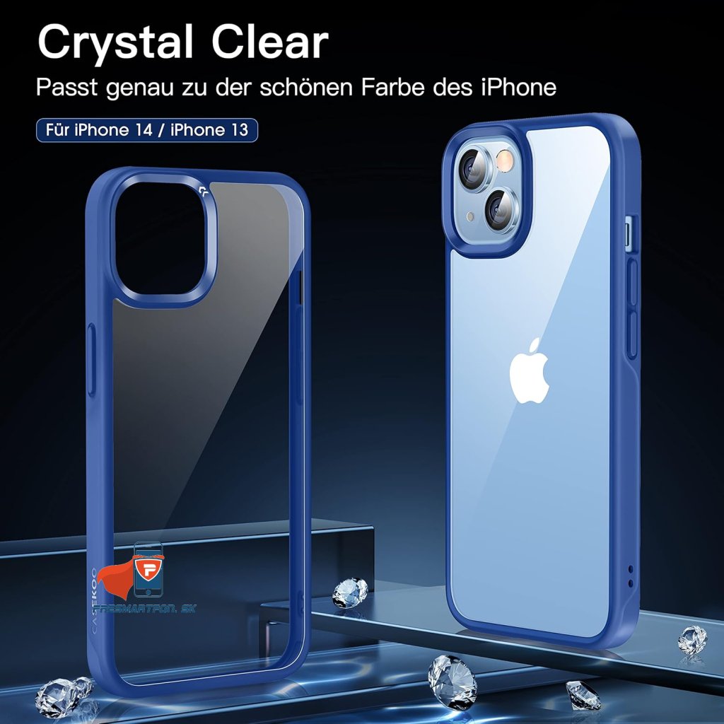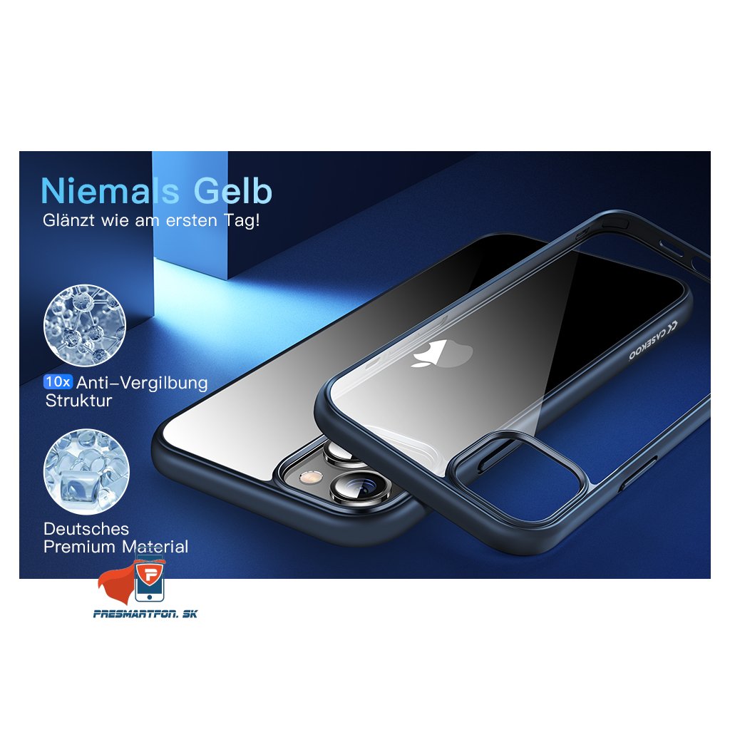 iPhone 13 / 14 zadné púzdro priehľadné nežltnúce s pogumovaným modrým lemom. V balení aj stojan na stôl.