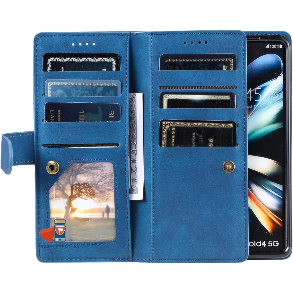 9 priehradok na karty, z toho jedna s okienkom, 2 priehradky na bankovky a priečinok na zips.Funkcia stojanu pre pozeranie videí.360-stupňová ochrana. Zapínanie na magnet.
